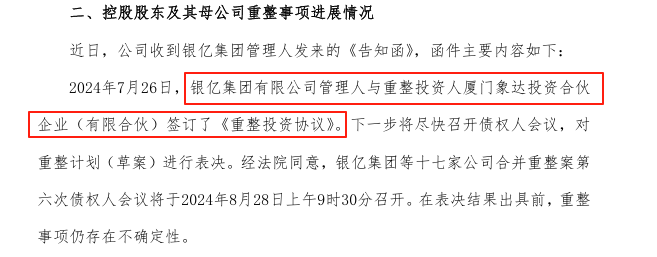 此前,廈門象嶼集團有限公司參與銀億集團重整計劃。據河化股份2024年7月30日公告,銀億集團有限公司管理人與重整投資人廈門象達投資合伙企業(有限合伙)簽訂了《重整投資協議》。據企查查查詢到的信息顯示,廈門象達其出資人主要是廈門象嶼資產管理運營有限公司(以下簡稱“象嶼資產”),象嶼資產為象嶼集團下屬企業廈門象嶼金象控股集團有限公司(以下簡稱“象嶼金象”)的全資子公司。業內人士認為,廈門象嶼作為世界500強國企,成為銀億集團的主要重整投資人,將為銀億企業的戰略發展提供根本性的保障。
