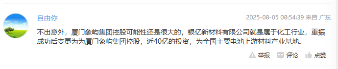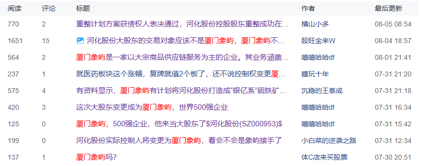 在河化股份控制權變更公告前,曾有投資者在股吧中表示:“廈門象嶼作為戰略投資者,未來可能通過股權劃轉或協議轉讓成為河化股份實際控制人。”