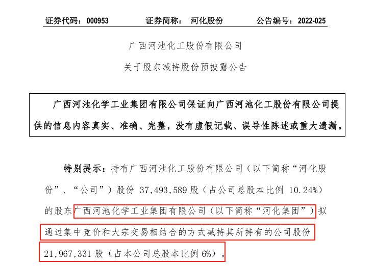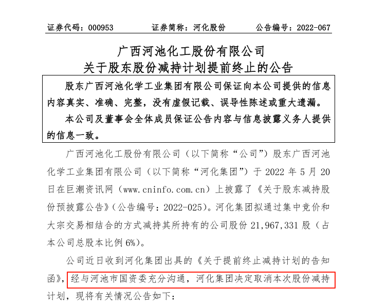 河化股份2022年5月25日晚間公告顯示,河池市國資委向上市公司發出一份《關于要求公開披露河化集團減持股份爭議事項的函》,河池市委認為河化集團的公告隱瞞了重要的承諾事項,本次減持違反了河池市國資委與河化集團的上級單位關于不得減持公司股份的相關約定,要求公司對河池市國資委提出的異議信息予以披露。