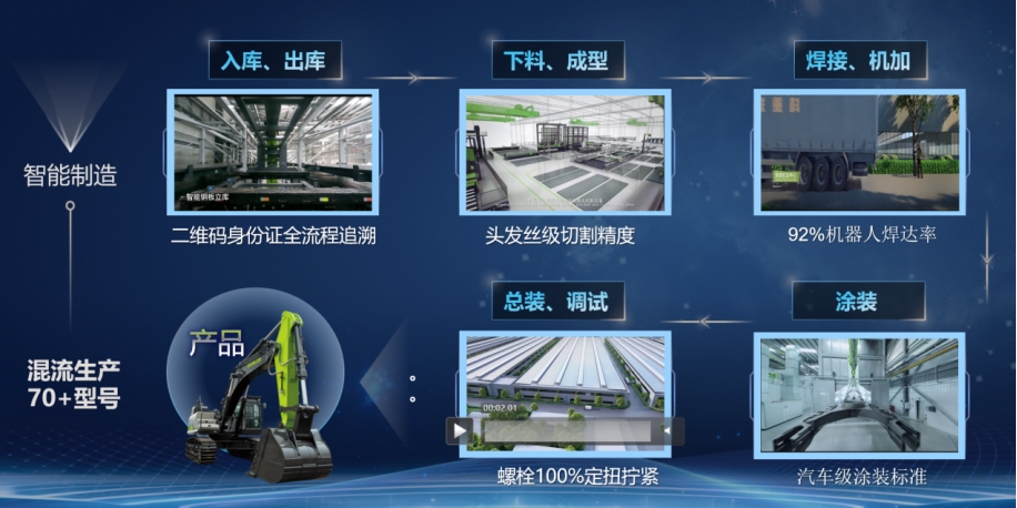 從2019年開始,中聯重科大規模使用具備感知與移動能力的自適應機器人,主要是帶視覺和力觸覺識別的機械臂、AMR自主移動機器人等。位于湖南長沙的中聯智慧產業城,集成建設了300多條智能制造生產線,使用了超過2000個工業機器人,從鋼板入庫,到出庫,再到下料、焊接、機加、涂裝、總裝,整個流程通過二維碼實現全生命周期追溯與調度。