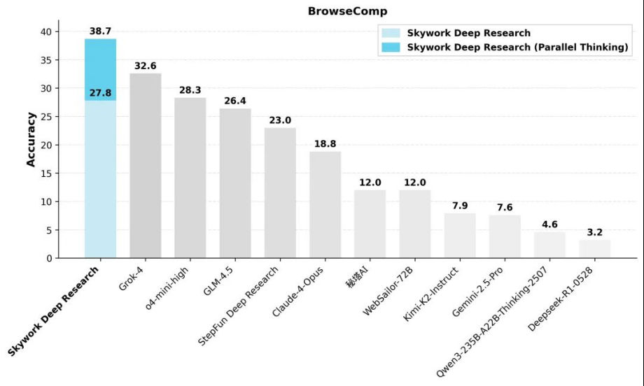 在權威的搜索評測榜單BrowseComp上,Skywork Deep Research的表現尤為突出。常規模式下,其性能已超越大多數同類產品,正確率達到27.8%。而一旦開啟自主研發的“并行思考”(Parallel Thinking)模式,正確率更是躍升至38.7%,刷新了行業SOTA紀錄。