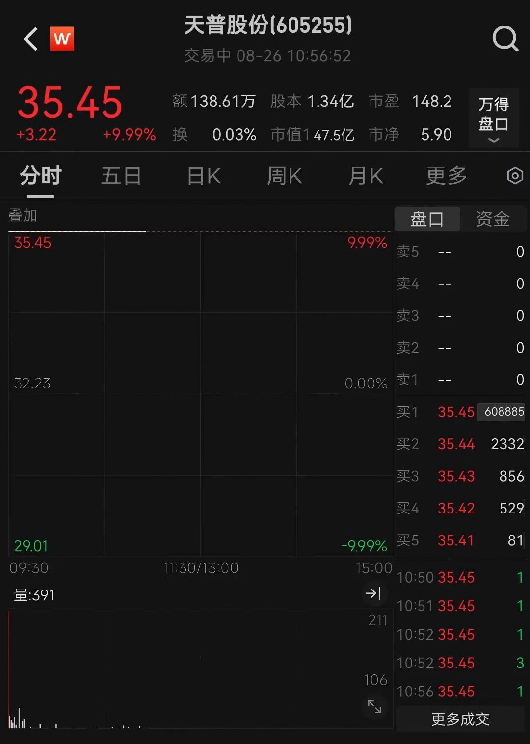今日早盤,擬轉讓公司控制權的天普股份(605255)延續此前的“一字”漲停走勢,截至發稿時斬獲“三連板”,股價創下歷史新高。近3個交易日內區間漲幅為33.07%,區間換手僅0.45%。