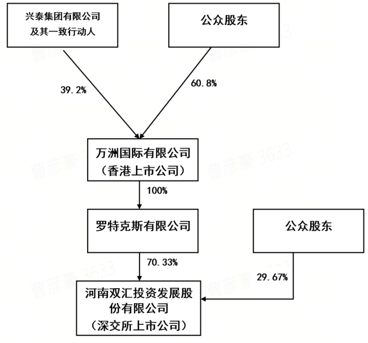雙匯發展公眾股東占比29.67%、大股東羅特克斯占比70.33%。羅特克斯是萬洲國際100%控股的公司,萬洲國際作為港股上市公司,其公眾股占比60.80%、實控人及一致行動人合計持股39.20%。