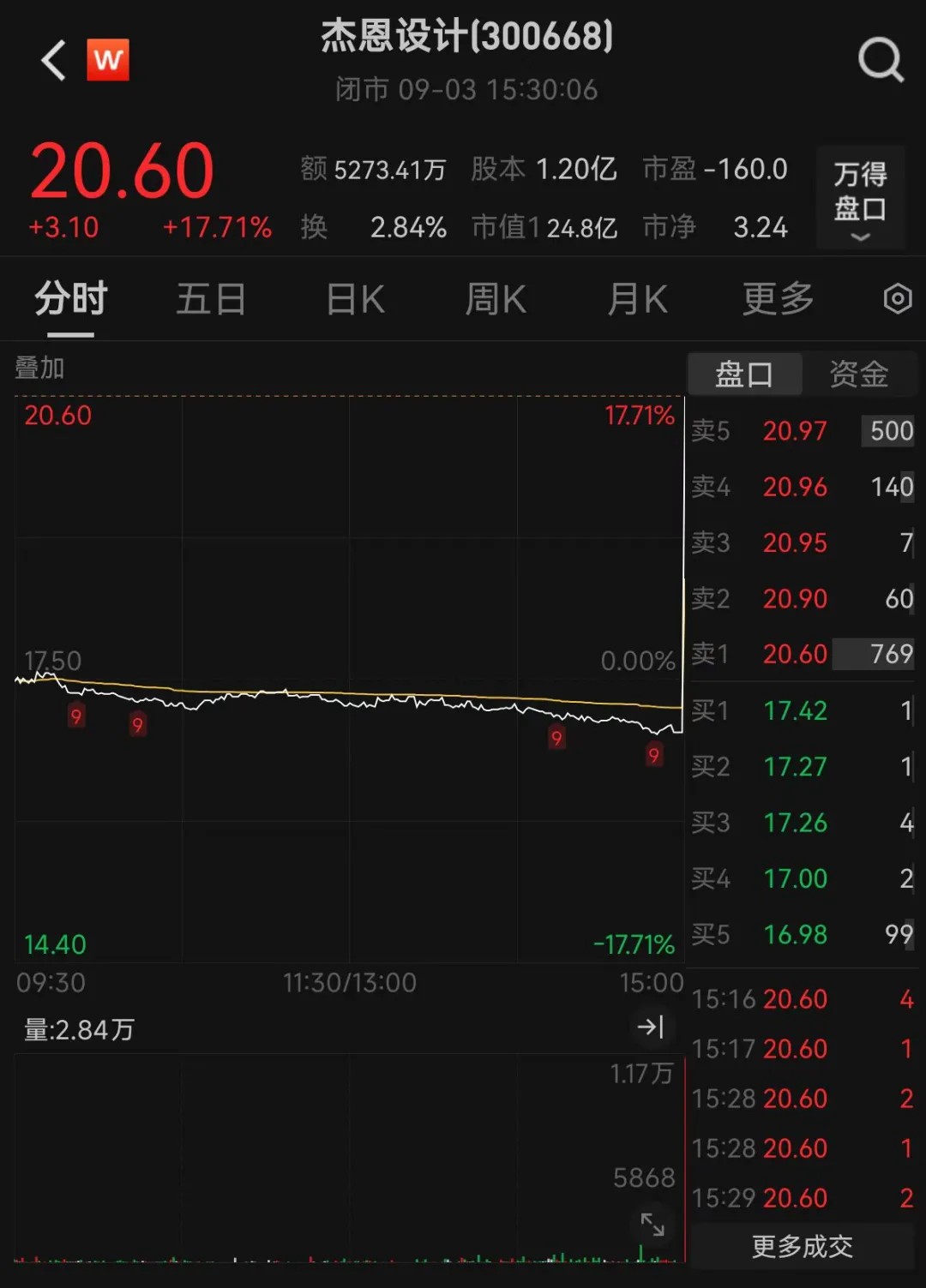 今日距離收盤還有1分鐘時間,杰恩設計(300668)股價突然異動,從水下直線拉升。截至收盤,該股股價報20.6元/股,漲幅為17.71%。早間開盤時,杰恩設計股價一直在低位震蕩,臨近尾盤時,還一度下跌超3%。
