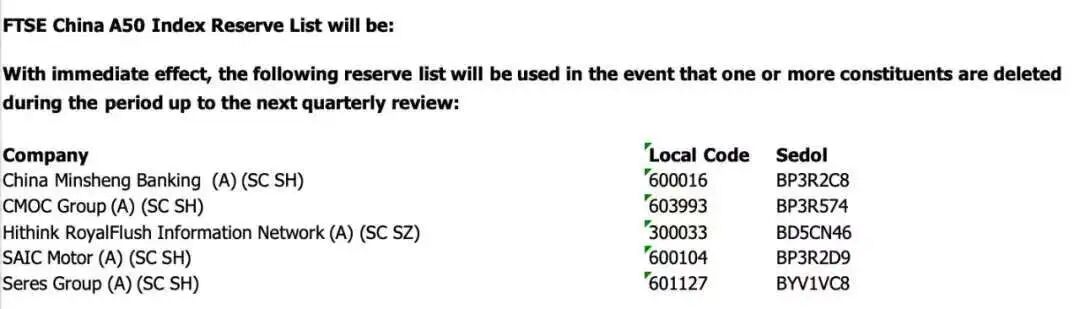 此外,本次季度調整中,民生銀行、洛陽鉬業、同花順、上汽集團、賽力斯進入富時中國A50指數備選股名單。備選名單即刻生效,直到下季度成分股審核前,如果有一個或多個成分股被刪除,即選用備選股。