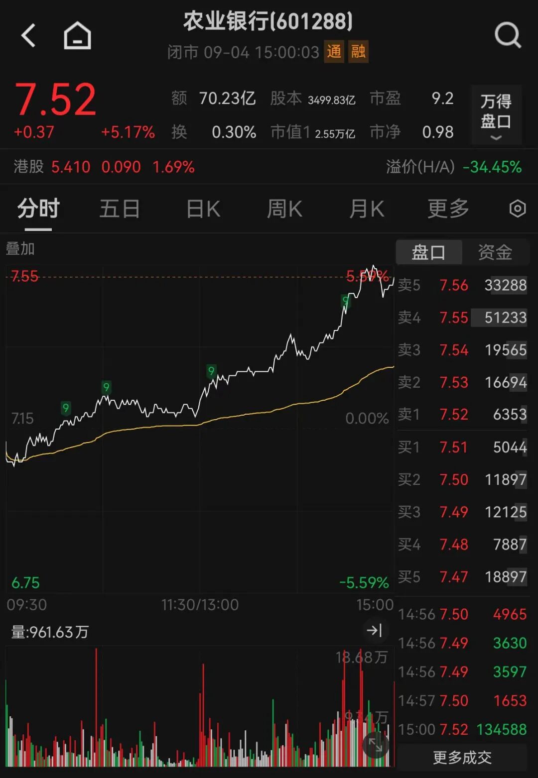 銀行板塊臨近尾盤(pán)表現(xiàn)活躍。其中,農(nóng)業(yè)銀行(601288)漲超5%,股價(jià)創(chuàng)下歷史新高,截至收盤(pán),該股股價(jià)報(bào)7.52元/股,總市值為2.63萬(wàn)億元,距離“宇宙第一大行”工商銀行2.69萬(wàn)億元的總市值僅一步之遙。郵儲(chǔ)銀行漲近3%,同樣創(chuàng)出歷史新高,中信銀行、工商銀行、中國(guó)銀行等跟漲。