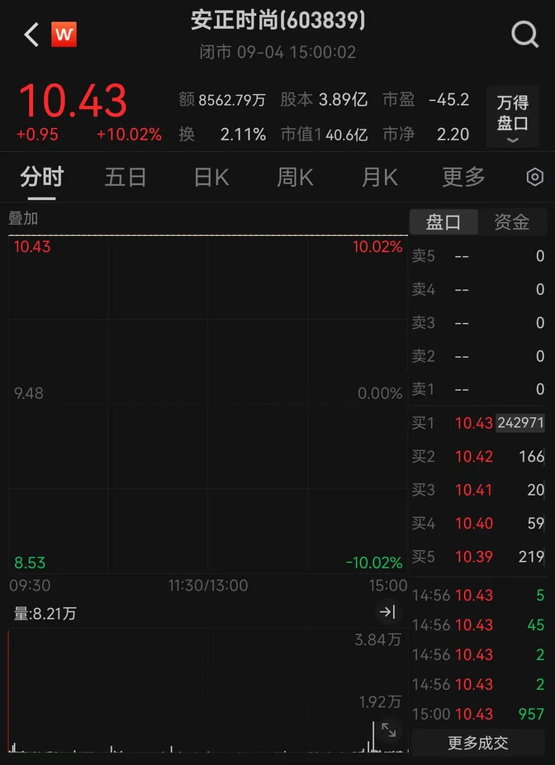 大消費(fèi)板塊今日逆勢(shì)走強(qiáng),商業(yè)百貨、食品飲料、美容護(hù)理、旅游酒店等領(lǐng)漲。潤(rùn)普食品實(shí)現(xiàn)“30CM”漲停,歡樂(lè)家、安記食品、國(guó)芳集團(tuán)、步步高等多只個(gè)股漲停。其中,安正時(shí)尚今日開(kāi)盤(pán)即“一字”漲停,連收三個(gè)漲停板,截至收盤(pán),該股股價(jià)報(bào)10.43元/股,3個(gè)交易日內(nèi)累計(jì)上漲33.04%。昨日晚間,安正時(shí)尚發(fā)布公告稱,經(jīng)公司自查,截至本公告披露日,除公司已披露的信息外,未發(fā)現(xiàn)對(duì)公司股票交易價(jià)格可能產(chǎn)生較大影響的媒體報(bào)道或市場(chǎng)傳聞,亦未涉及市場(chǎng)熱點(diǎn)概念的事項(xiàng)。