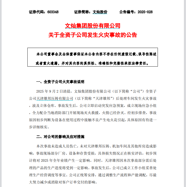 4日盤后,文燦股份(603348)發布公告稱,2025年9月2日清晨,公司全資子公司天津雄邦壓鑄有限公司(以下簡稱“天津雄邦”)后處理車間發生火災事故,波及立體倉庫。事故發生后,公司立即啟動突發應急預案,成立現場應急小組,全力配合當地消防部門開展現場滅火救援,火情已經撲滅。經初步排查,事故原因初步判斷為設備在使用過程中接觸不良產生電火花,具體原因有待進一步詳細核實。