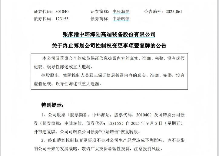 昨日晚間,中環海陸發布公告稱,因公司控股股東、實際控制人吳君三與交易對方就公司未來發展安排未達成一致意見,經相關方協商一致,決定終止本次控制權變更事項。公司股票及可轉債于2025年9月5日復牌。