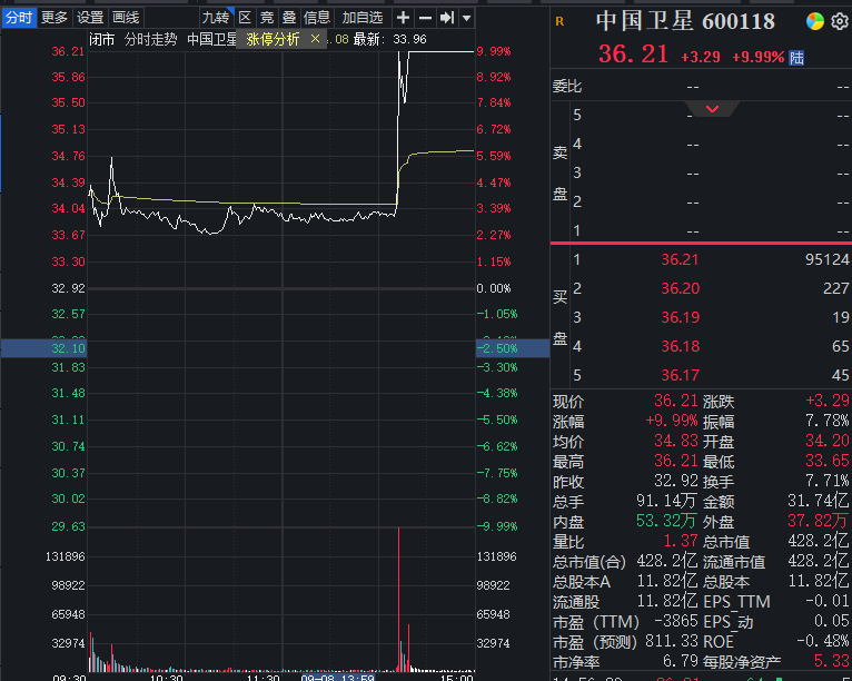 個股方面,下午14時09分,中國聯通突然涌入大量買單,4分鐘時間成交額便突破8億元,其中大單凈流入超過5億元。該股股價也憑此急速拉升逾5%。幾乎同一時間,中國衛星股價直線拉升至漲停,雖此后有所回落,但很快便再次封住漲停板,買一金額一度超過8億元。