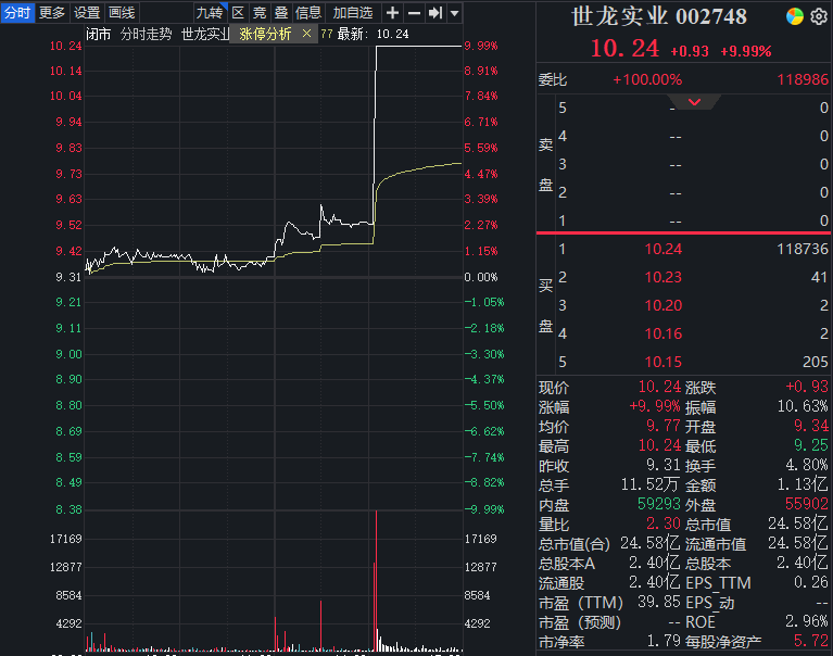 同樣上演直線拉升漲停的還有世龍實業,公司股價于14時02分突然啟動拉升,僅用時約2分鐘便直沖漲停,隨后一直保持至收盤。