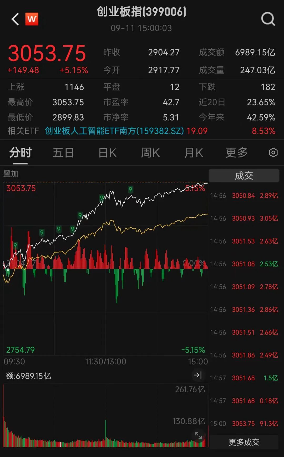 11日,創業板指早間小幅下探后震蕩上揚,截至收盤,該指數上漲5.15%,報收3053.75點,再度創下年內新高。此外,科創50盤中也一度漲超5%。