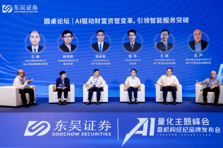 首場論壇以“AI驅動財富資管變革,引領智能服務突破”為主題,由東吳證券私人財富部聯席總經理江帆主持。嘉賓圍繞AI在客戶畫像、投資決策、風險控制等領域的突破展開討論。東吳期貨總經理施偉、蘇新基金林茂政、國泰海通證券莊嚴等多位專家分享了在AI時代構建數據護城河、應對科技公司挑戰的見解。蘇州信托張必松與東吳資管王碩則就AI大模型在投研分析與投資決策中的實際應用進行了深入交流。嘉賓一致認為,AI將推動財富管理向更智能、個性化方向發展,并展望了未來3-5年內AI在全面自主投資、實時風控等領域的突破可能性。