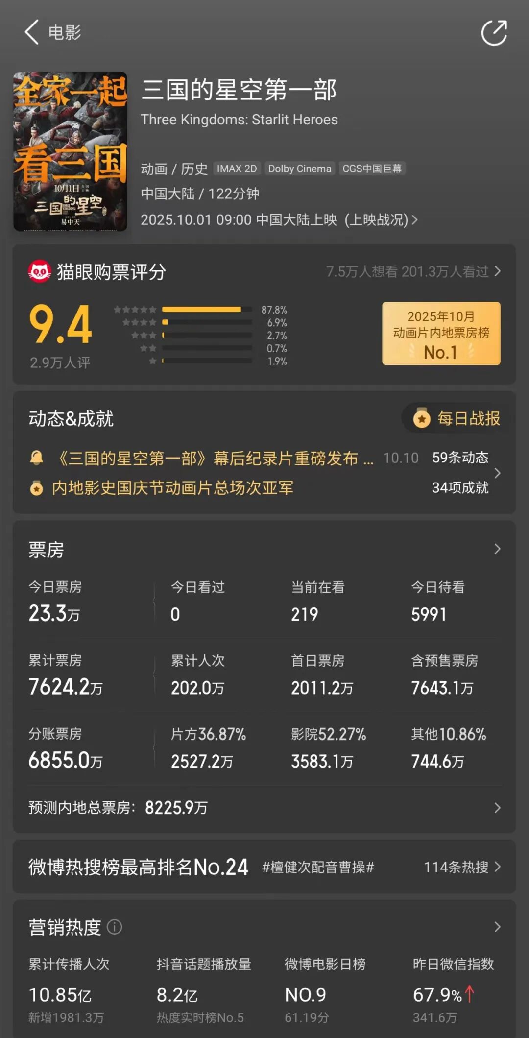 貓眼專業版數據顯示,截至10月11日上午9時49分,《三國的星空第一部》的總票房為7642.2萬元,其中分賬票房為6855萬元(片方占比36.87%,約為2527.2萬元)。該頁面顯示,該影片的預測內地票房僅有8225.9萬元。