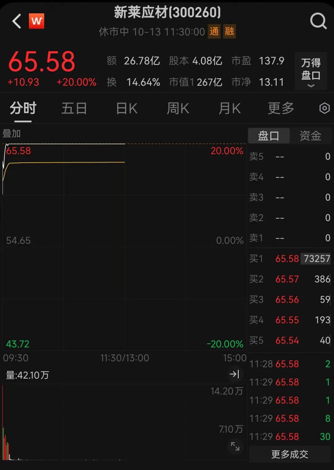 10月13日早盤,新萊應(yīng)材高開后僅6分鐘就沖上漲停,報65.58元/股,收獲“兩連板”的同時創(chuàng)歷史新高。