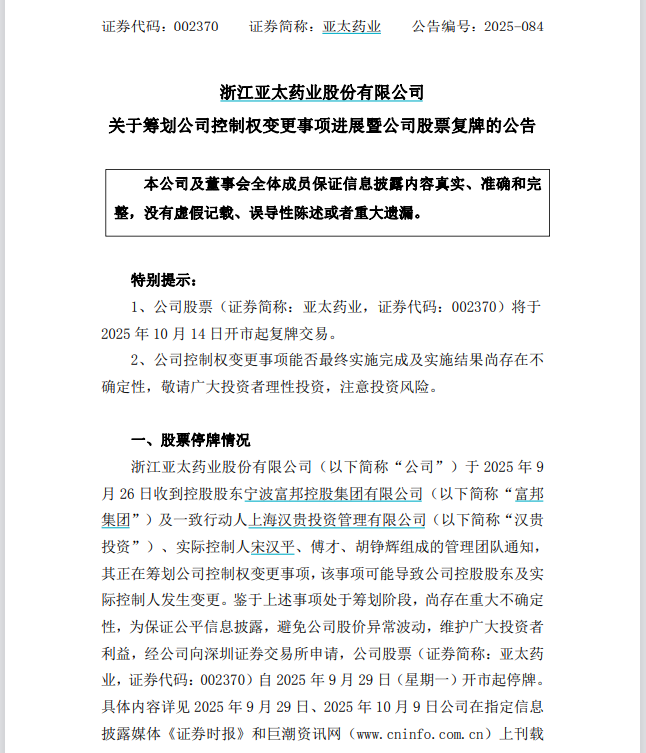 9月28日,亞太藥業(yè)公告稱,公司控股股東正在籌劃公司控制權(quán)變更事項,公司股票自9月29日開市起停牌。昨日晚間,變更方案正式揭曉:亞太藥業(yè)控股股東擬通過協(xié)議轉(zhuǎn)讓方式,向星浩控股轉(zhuǎn)讓公司14.61%股份,轉(zhuǎn)讓價格為8.26元/股,合計總金額為9億元。轉(zhuǎn)讓完成后,公司控股股東將變更為星浩控股,實控人變更為邱中勛。