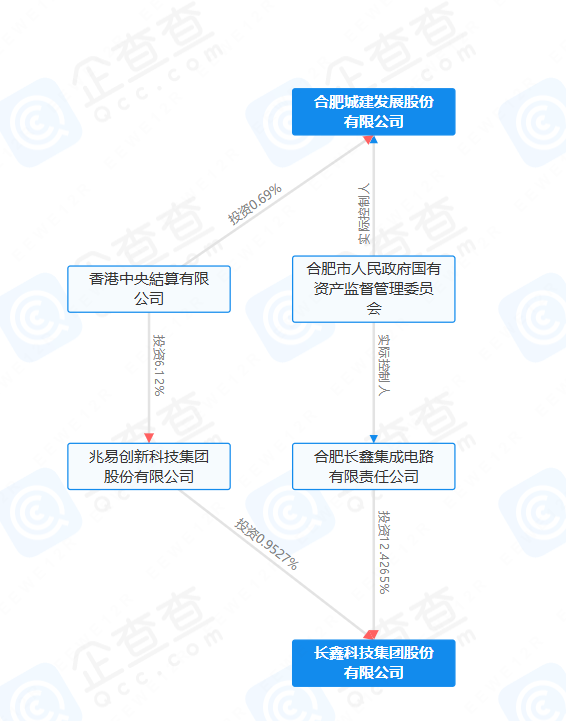 經(jīng)企查查數(shù)據(jù)股權(quán)穿透可見,合肥城建和長鑫集成的實(shí)控人均為合肥市國資委,而長鑫集成對外投資了長鑫科技,其對后者的持股比例為12.4265%,間接持股比例為11.893%。