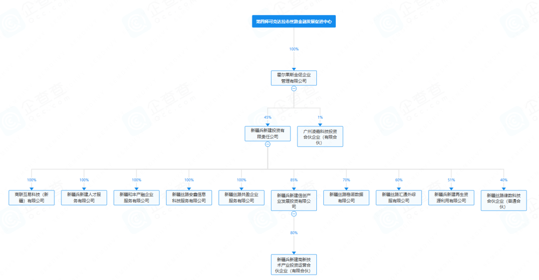 經企查查數據股權穿透后可見,新疆兵新建合伙由新疆兵新建投資有限責任公司(下稱“兵新建投資”)間接控制,由四師金促中心實際控制(總持股比例為30.6%)。