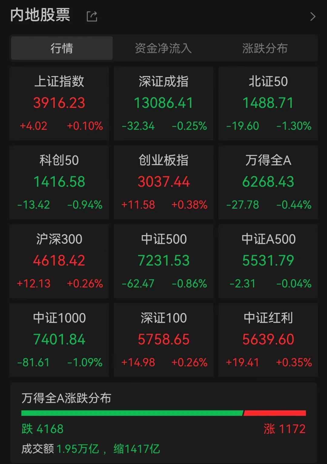 16日,A股三大指數表現分化,全市場個股漲跌中位數為-1.26%。滬深兩市成交額回落至2萬億元以下,較昨日縮量1417億元。
