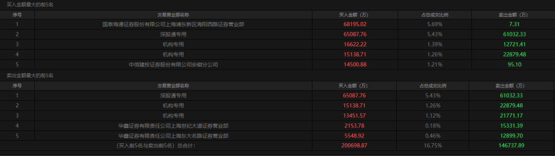 這場風波似乎也波及到了頂級游資“章盟主”。從昨日的龍虎榜數據來看,“章盟主”所在國泰海通上海浦東新區海陽西路營業部席位以6.82億元的買入金額,位居買一位置;深股通“左右互搏”買入6.51億元并賣出6.1億元;機構席位凈賣出。