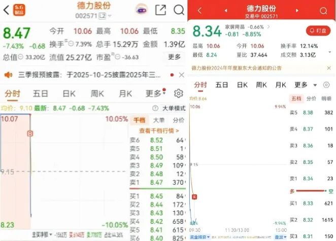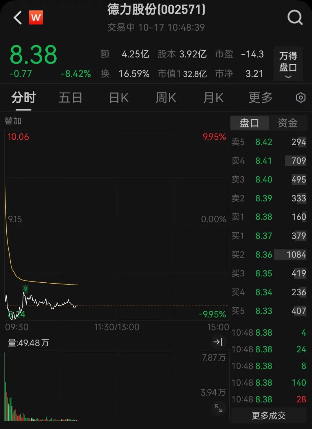 德力股份,漲停次日上演“準(zhǔn)天地板”