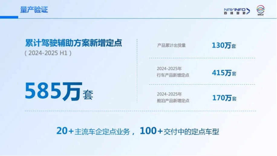 同時,程鵬公布四維圖新智駕業務當前進展:2024年至2025年上半年,四維圖新與鑒智機器人累計獲得585萬套智駕方案的新增定點,覆蓋20+主流車企,100+定點車型,量產訂單處于行業領先位置。
