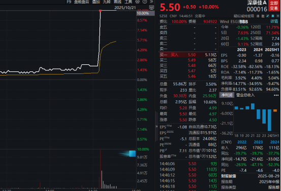20日下午14時34分21秒,7320手買單突然涌入深康佳A(000016),隨后該股股價直線拉升,僅用時1分30秒,便在14時35分51秒沖上漲停板。
