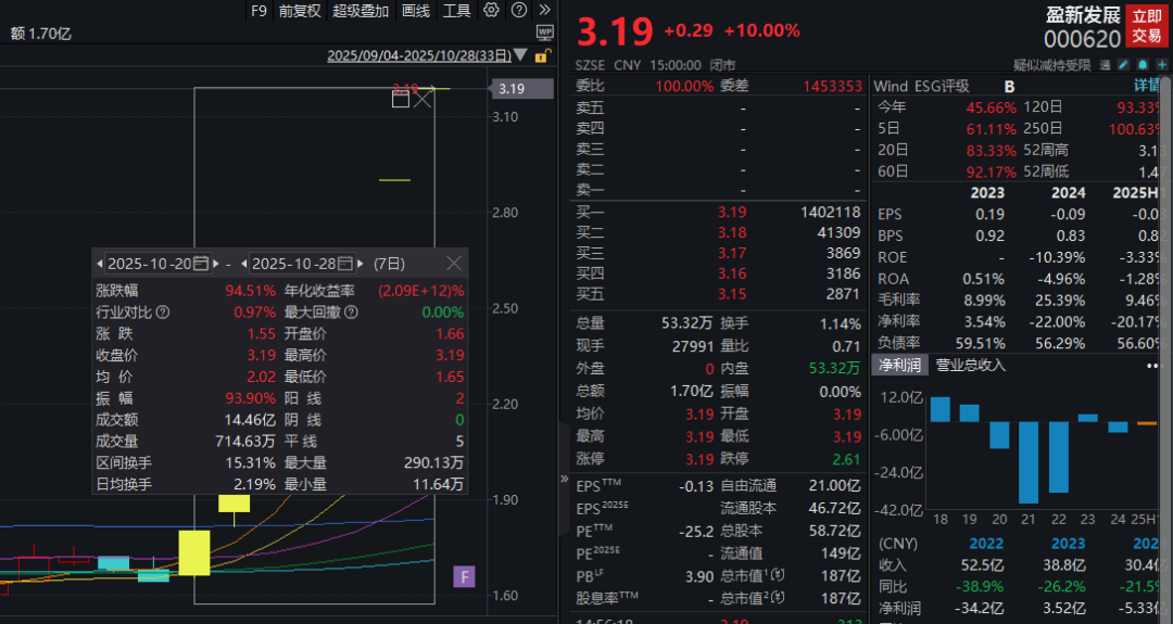Wind數(shù)據(jù)顯示,7個(gè)交易日內(nèi),盈新發(fā)展股價(jià)累計(jì)上漲94.51%,其間Wind同行業(yè)(二級(jí)行業(yè))指數(shù)上漲0.97%。截至28日收盤,該股股價(jià)報(bào)3.19元/股,換手率僅有1.14%。