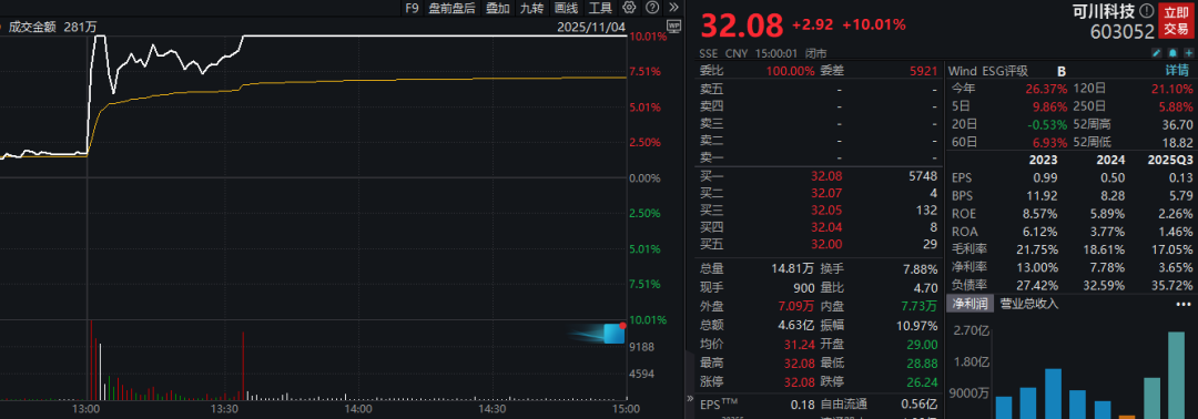 11月4日午后開盤,隨著一筆3376手的買單涌入可川科技(603052),公司股價火速拉升,僅用時1分52秒便沖上漲停。