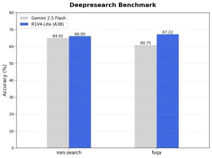 從結(jié)果上看,R1V4-Lite在多模態(tài)DeepResearch類任務(wù)中展現(xiàn)出了領(lǐng)先趨勢(shì):在mm-search上以66分超過(guò)Gemini 2.5 Flash的64.9分,在FVQA上以67分顯著領(lǐng)先Gemini 2.5 Flash的60.8分。這一系列結(jié)果強(qiáng)有力地驗(yàn)證了“圖像操作×深度推理交織訓(xùn)練”范式的有效性。