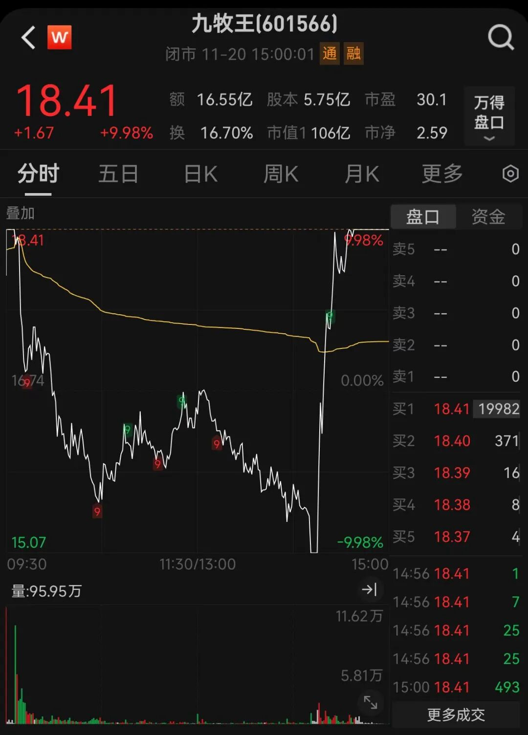 今日,男褲領軍品牌九牧王(601566)股價盤中巨震,上演極致“天地天”行情,成功拿下“七連板”。