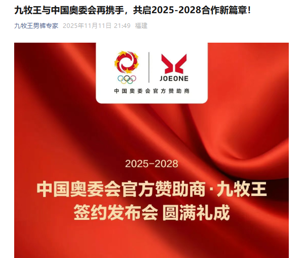 九牧王此輪暴漲行情始于11月12日。當日上午,其股價突然異動,直線拉升至漲停。市場普遍認為,這與前日晚間公司官宣成為“中國奧委會官方贊助商”的消息密切相關。