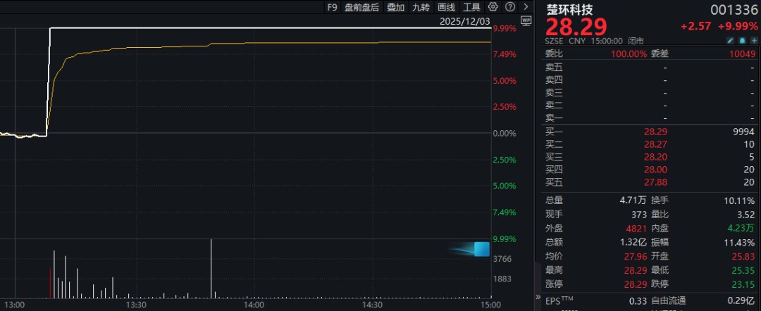 12月3日午后,楚環科技(001336)股價突然直線拉升,僅用時18秒就觸及漲停。