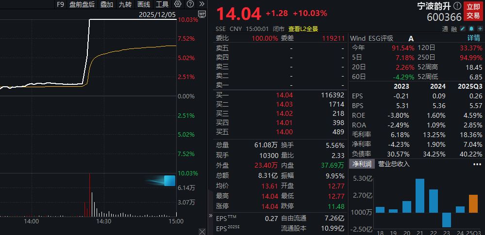 寧波韻升(600366)今日早盤維持橫盤震蕩,午后股價突然直線拉升,僅約2分半即封住漲停。截至收盤,該股股價收漲10.03%,報14.04元/股,買一位置仍有超過11萬手排隊等候成交。
