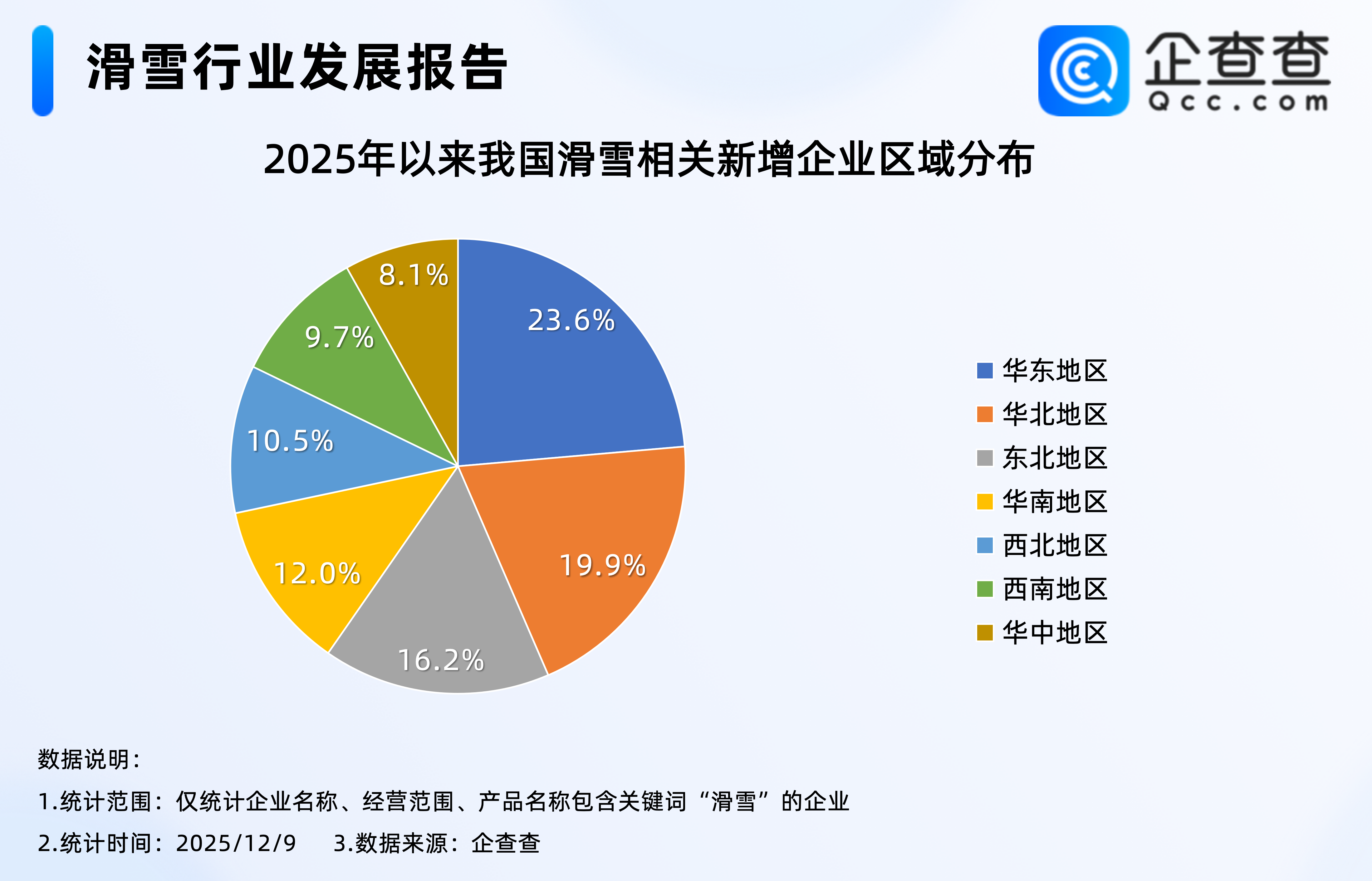 企查查數據顯示,2025年以來我國已注冊2309家滑雪相關企業,與存量企業區域分布不同的是,今年新注冊相關企業中,華東地區數量超過華北地區,占比達23.6%,成為今年全國滑雪新注冊相關企業最多的區域,華北地區占比19.9%,東北地區占比16.2%。