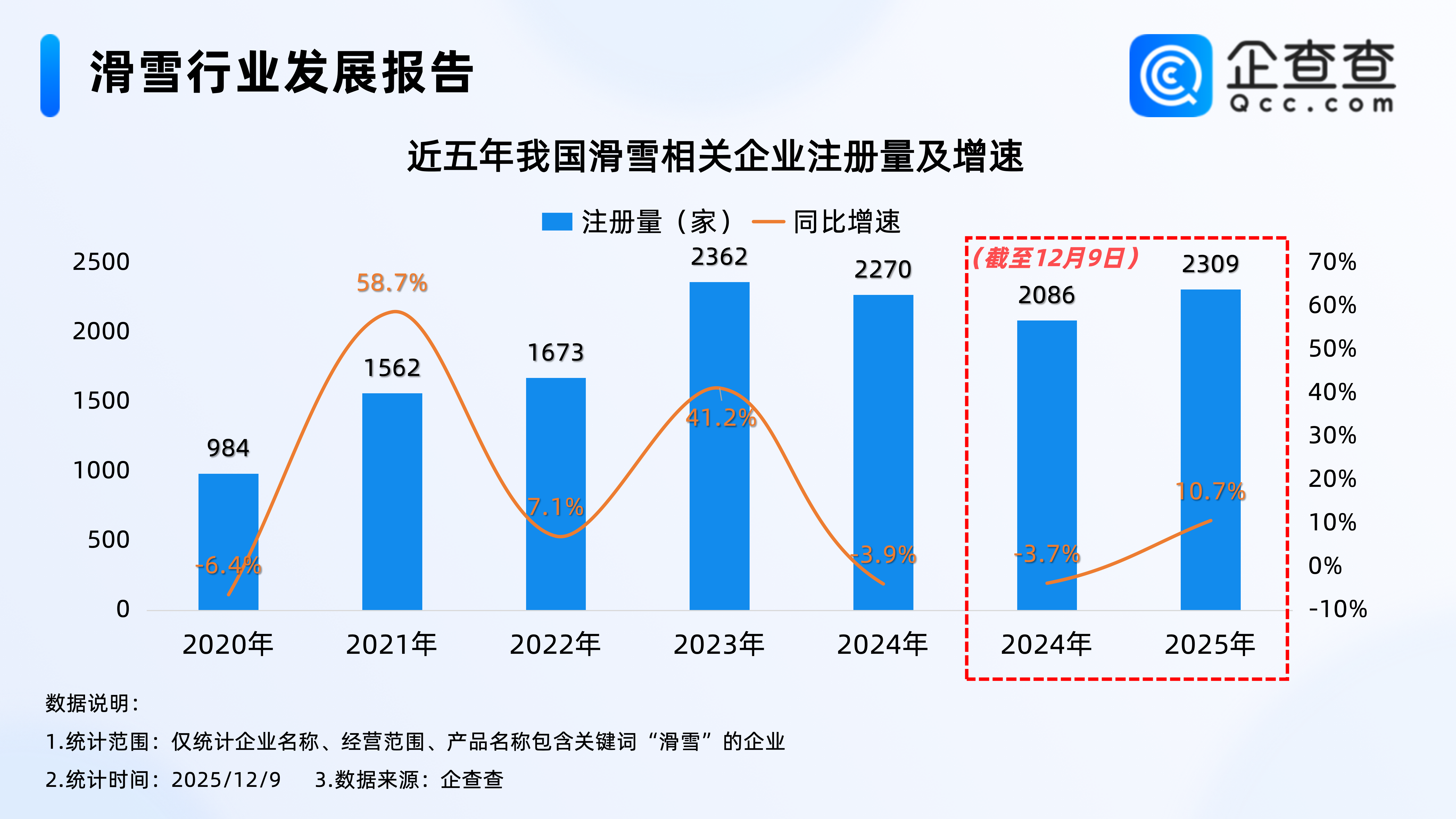 企查查數據顯示,2020年以來,我國滑雪相關企業注冊量整體穩步增加,2023年我國累計注冊2362家滑雪相關企業,達近五年注冊量峰值;截至12月9日,2025年我國已注冊2309家滑雪相關企業,相比2024年同期增加10.7%。