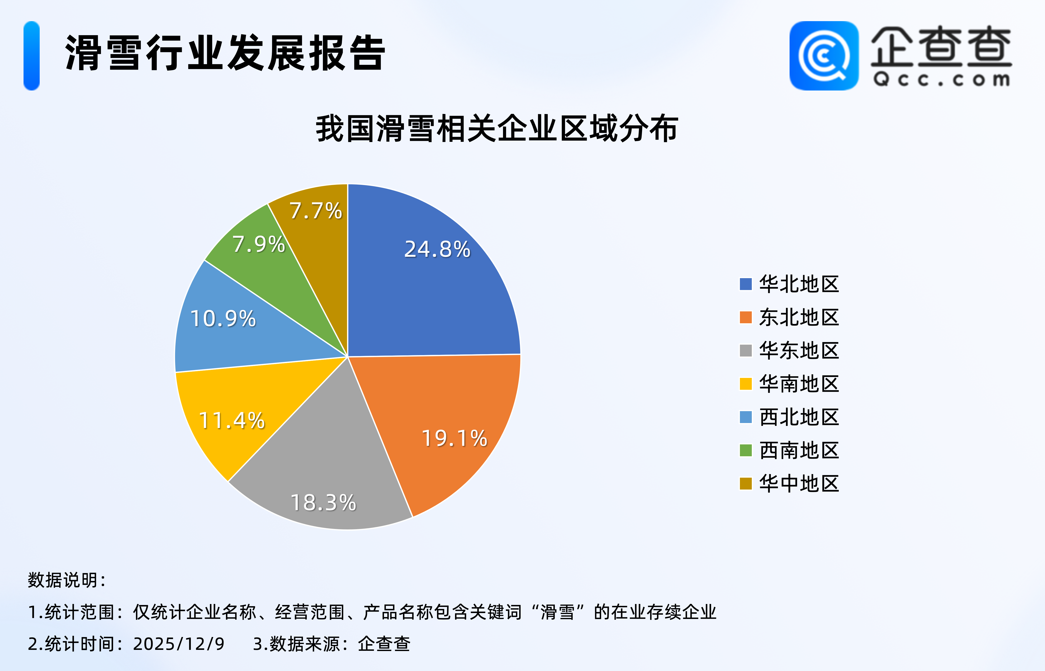 企查查數據顯示,截至12月9日,我國現存1.3萬家滑雪相關企業,區域分布上,分布在華北地區的相關企業最多,占比24.8%,其次是東北、華東地區,分別占比19.1%、18.3%。