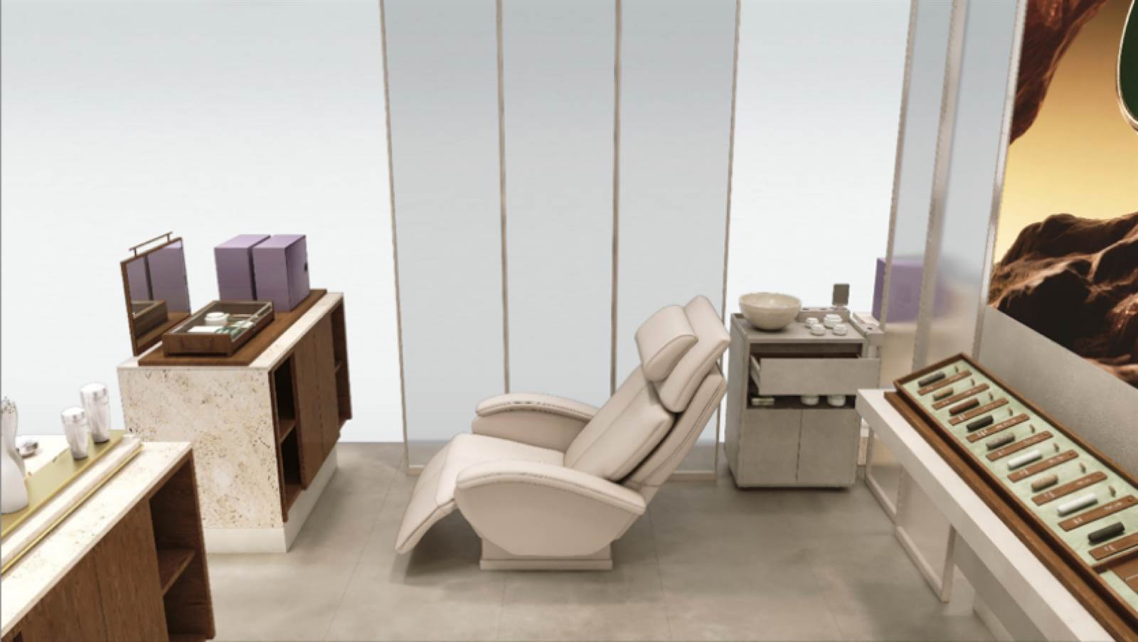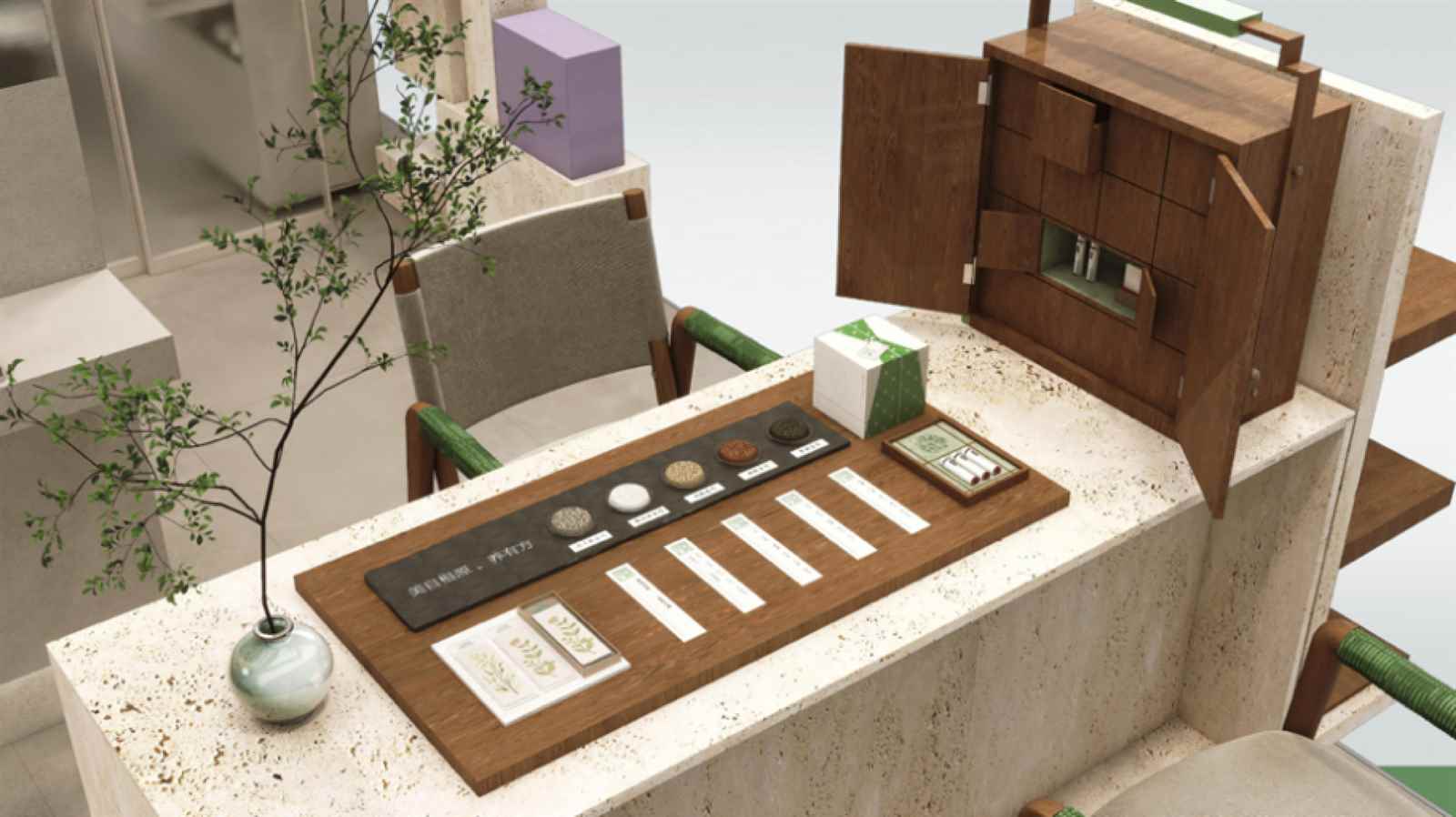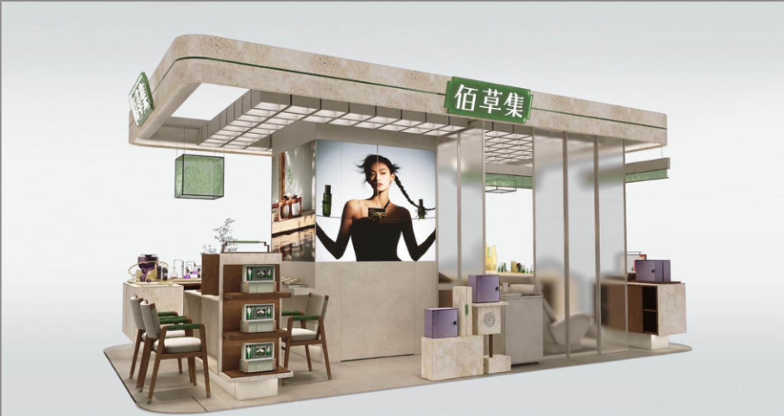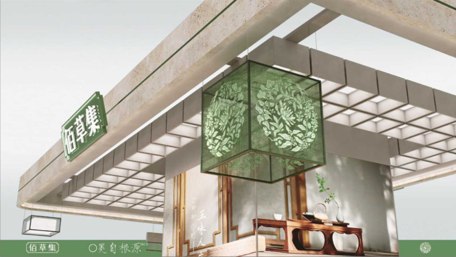 空間設計上,佰草集以中醫(yī)文化為原點,將傳統(tǒng)藥鋪的“百子柜”元素轉(zhuǎn)化為現(xiàn)代通透的陳列體系。洞石材質(zhì)的運用延續(xù)了古代石臼研磨藥材的質(zhì)感,呼應“古石白搗藥”的源生意象;門頭設計提取自中藥鋪木質(zhì)牌匾的形制,以簡練線條傳遞莊重與信賴。墻面以“主視覺團花結(jié)合方”為視覺核心,將本草紋樣與古典圖案融為一體,構(gòu)筑具有辨識度的東方美學背景。