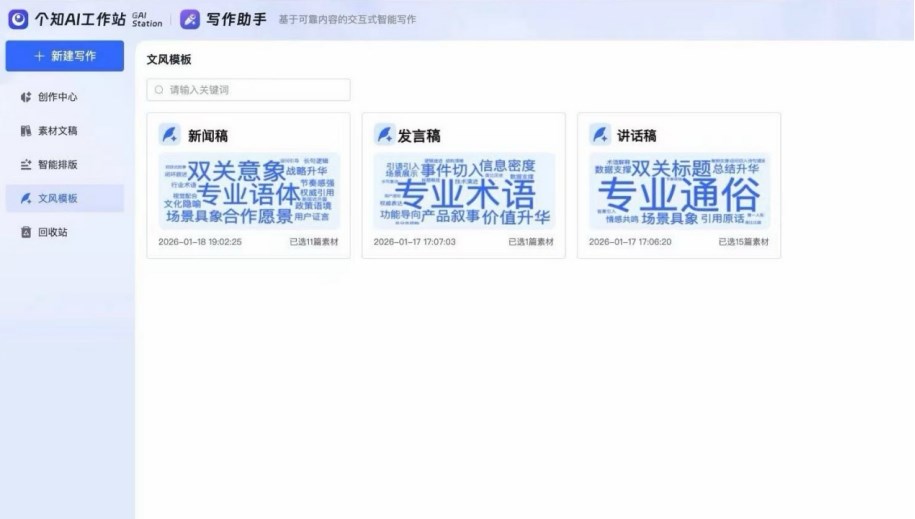 "個(gè)知·智能工作站"寫(xiě)作助手文風(fēng)管理功能示意