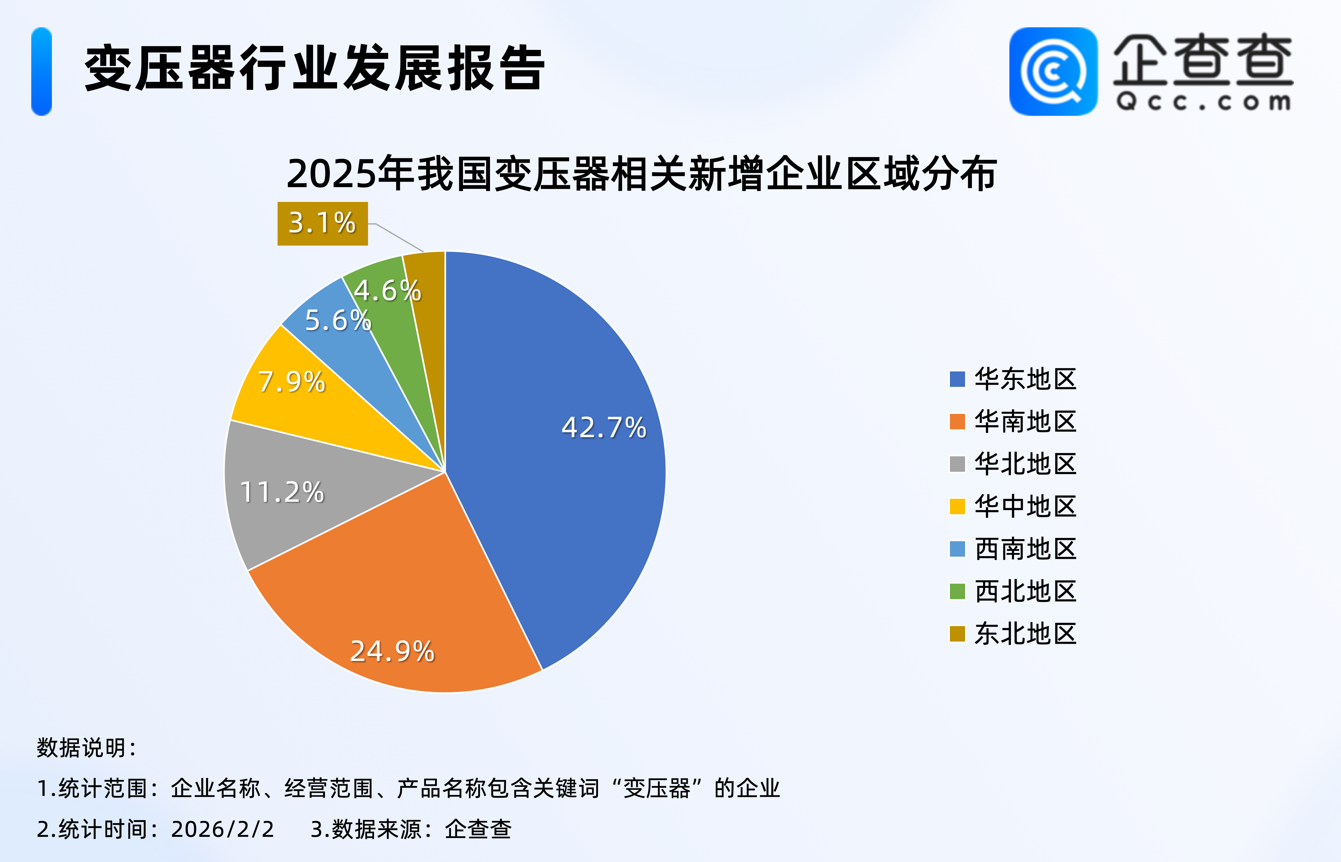 企查查數據顯示,2025年新注冊的1.3萬家變壓器相關企業中,位于華東地區的相關企業最多,占比42.7%,其次是華南地區,占比24.9%,西北、東北地區相對較少,分占4.6%、3.1%。