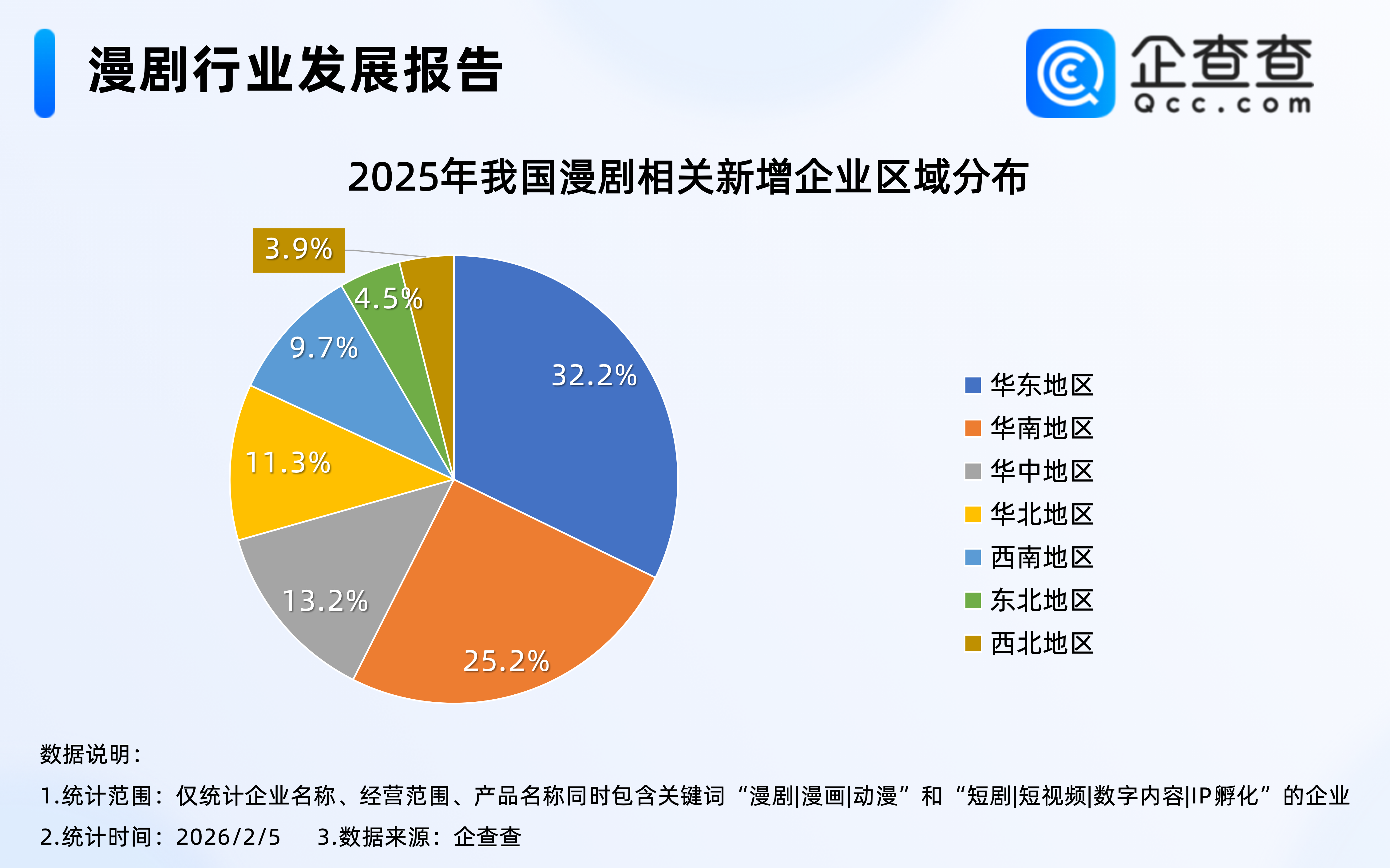 企查查數據顯示,2025年注冊的8萬余家漫劇相關企業中,位于華東地區的相關企業最多,占比32.2%,其次是華南地區,占比25.2%,東北、西北地區相對較少,分占4.5%、3.9%。