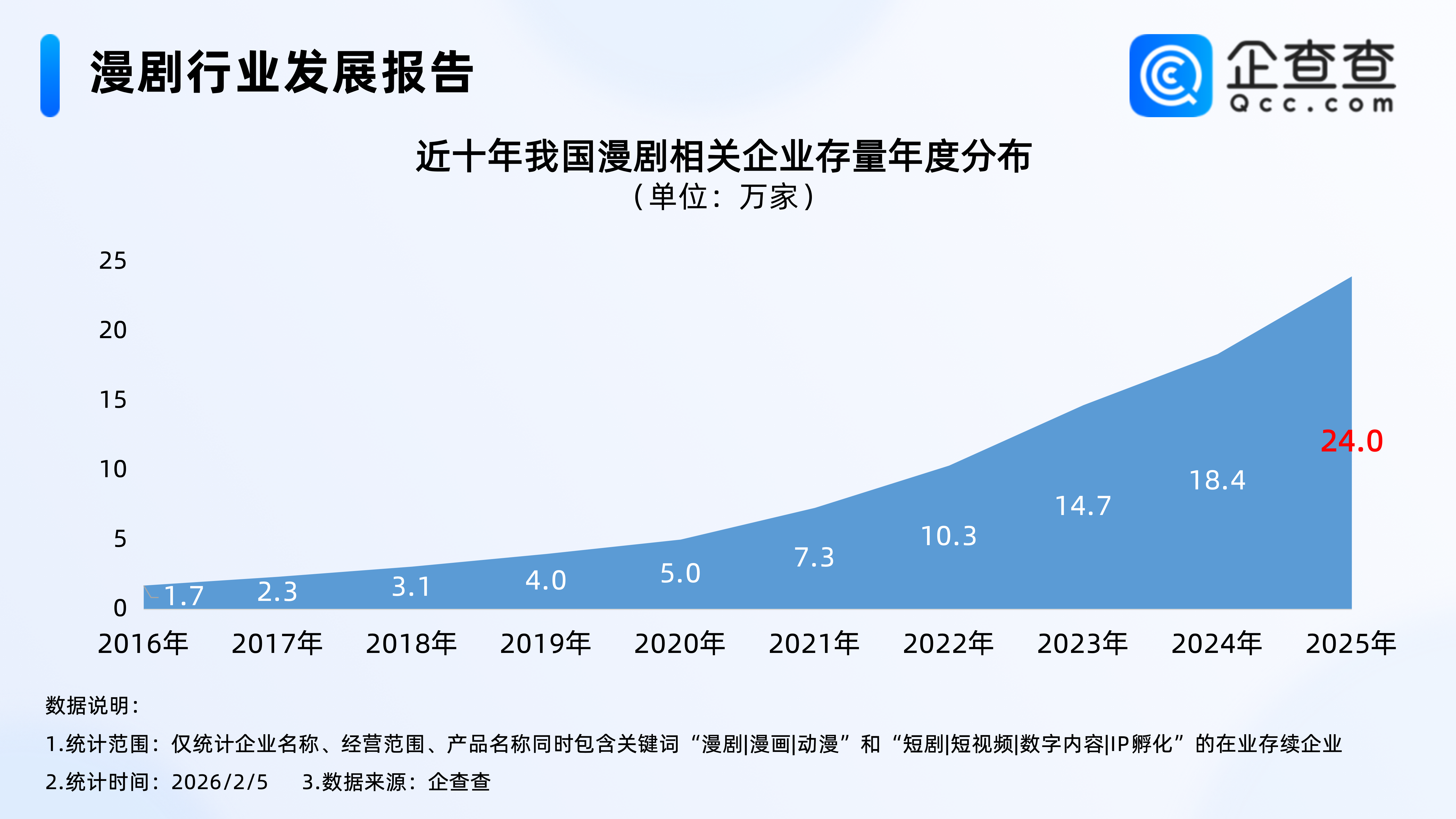 企查查數據顯示,近十年,我國漫劇相關企業存量逐年增加,2022年相關企業存量正式突破10萬家,達10.3萬家;2025年年底,我國在業存續24.0萬家漫劇相關企業。截至2026年2月5日,我國現存24.5萬家漫劇相關企業。
