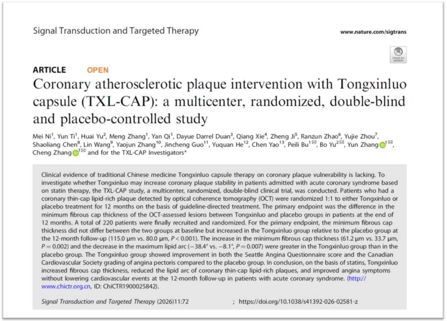 2月24日,“通心絡膠囊干預急性冠脈綜合征冠狀動脈粥樣硬化斑塊的隨機、雙盲、安慰劑平行對照、多中心臨床研究(TXL-CAP多中心研究)”論文在施普林格?自然集團(Springer Nature)主管的國際權威學術期刊《信號轉導與靶向治療》(Signal Transduction and Targeted Therapy,簡稱STTT,影響因子52.7)在線發表。結果顯示,在他汀等現代標準治療基礎上聯合使用通心絡,可顯著增加急性冠狀動脈綜合征患者冠狀動脈易損斑塊纖維帽厚度,減小斑塊脂質弧度,并改善心絞痛癥狀,為臨床穩定冠狀動脈斑塊提供了有效的治療手段。