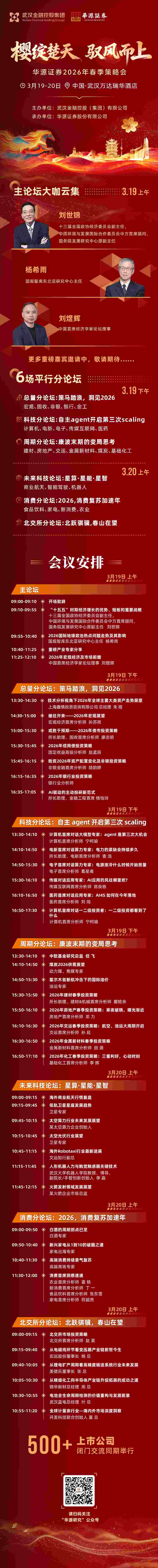 春回荊楚,櫻滿江城;3月22日,2026武漢馬拉松將鳴槍起跑。作為賽事官方贊助商和供應商,武漢金控集團與華源證券始終扎根江城、與城市同頻共振,讓“奔跑力量”與“金融賦能”深度融合,將金融國企的責任與擔當融入城市發展脈絡,于3月19日至20日在武漢聯合主辦“櫻綻楚天 馭風而上”——華源證券2026年春季策略會。活動匯聚政、產、學、研各界精英,邀請眾多行業領袖、知名專家學者、上市公司高管及資深投資人齊聚一堂,預計線上線下參會上市公司將超過500家,搭建產業鏈接橋梁,共同把脈宏觀經濟走勢,探尋產業變革機遇,彰顯智庫擔當。