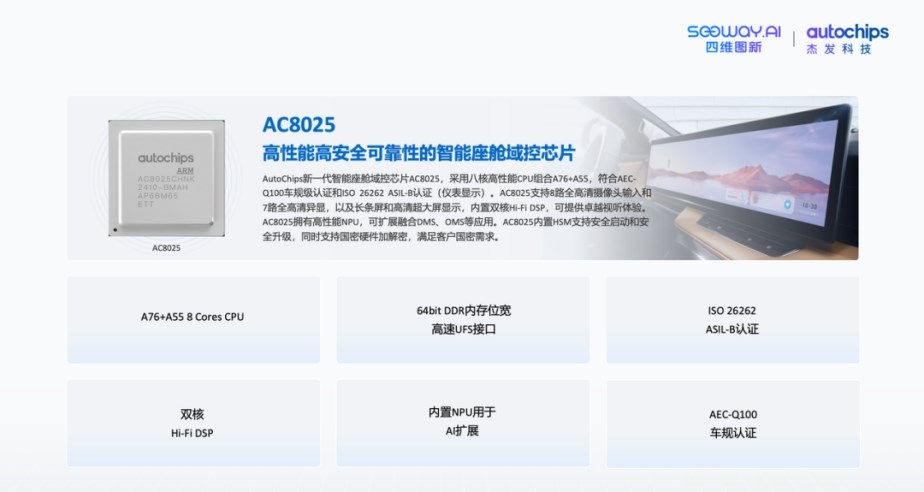 在雙方聯合推進的豐田與鄭州日產項目中,AC8025均順利達成量產并交付,并正在持續向更多新車型擴展。這兩個關鍵項目的落地,標志著AC8025能夠滿足國際車企嚴苛的質量標準與開發流程,并將在量產打磨中持續提升產品核心競爭力,為客戶及終端用戶提供高性價比、高可靠性和多樣化的智能座艙新體驗。