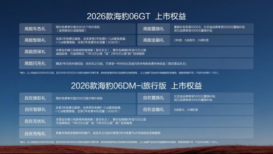 4月2日,比亞迪海洋網雙車齊發——2026款海豹06GT與2026款海豹06DM—i旅行版同步上市。其中,2026款海豹06GT官方指導價為12.89萬元—16.99萬元,2026款海豹06DM—i旅行版官方指導價為11.19萬元—13.99萬元,兩款新車還為用戶提供了涵蓋購車、選裝、養護等在內的多項權益,讓用戶真正實現無憂用車;2026款海豹06GT用戶更可享受1年閃充補能權益,盡情領略全場景自由閃充的科技魅力。
