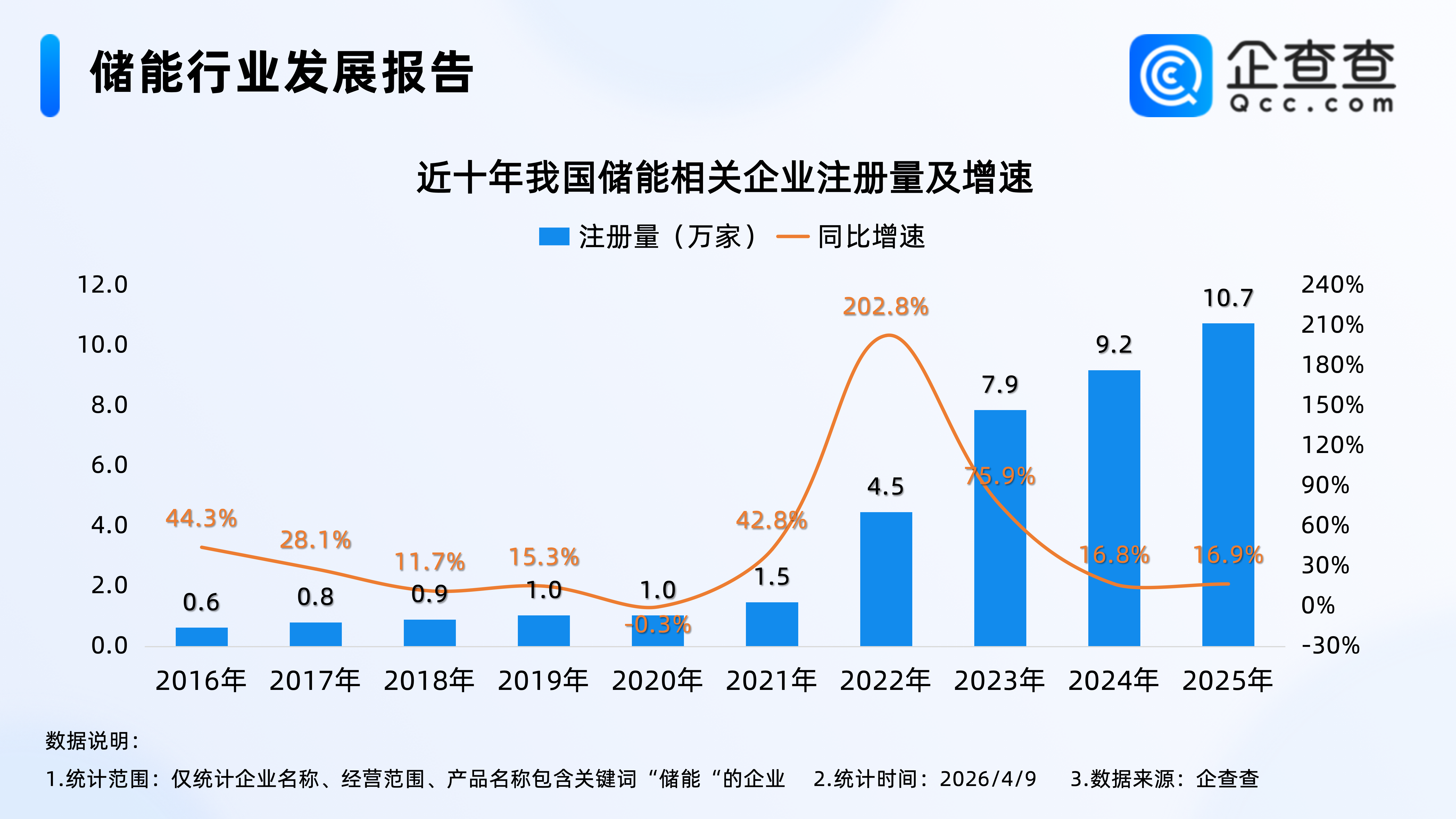 企查查數據顯示,近十年,我國儲能相關企業每年注冊量基本逐年增加,尤其是2022年,全年注冊量同比激增202.8%至4.5萬家,達近十年注冊量增速峰值,2025年全年注冊量同比增加16.9%至10.7萬家,創近十年儲能相關企業年度注冊量新高。截至4月9日,2026年我國已注冊2.8萬家儲能相關企業。