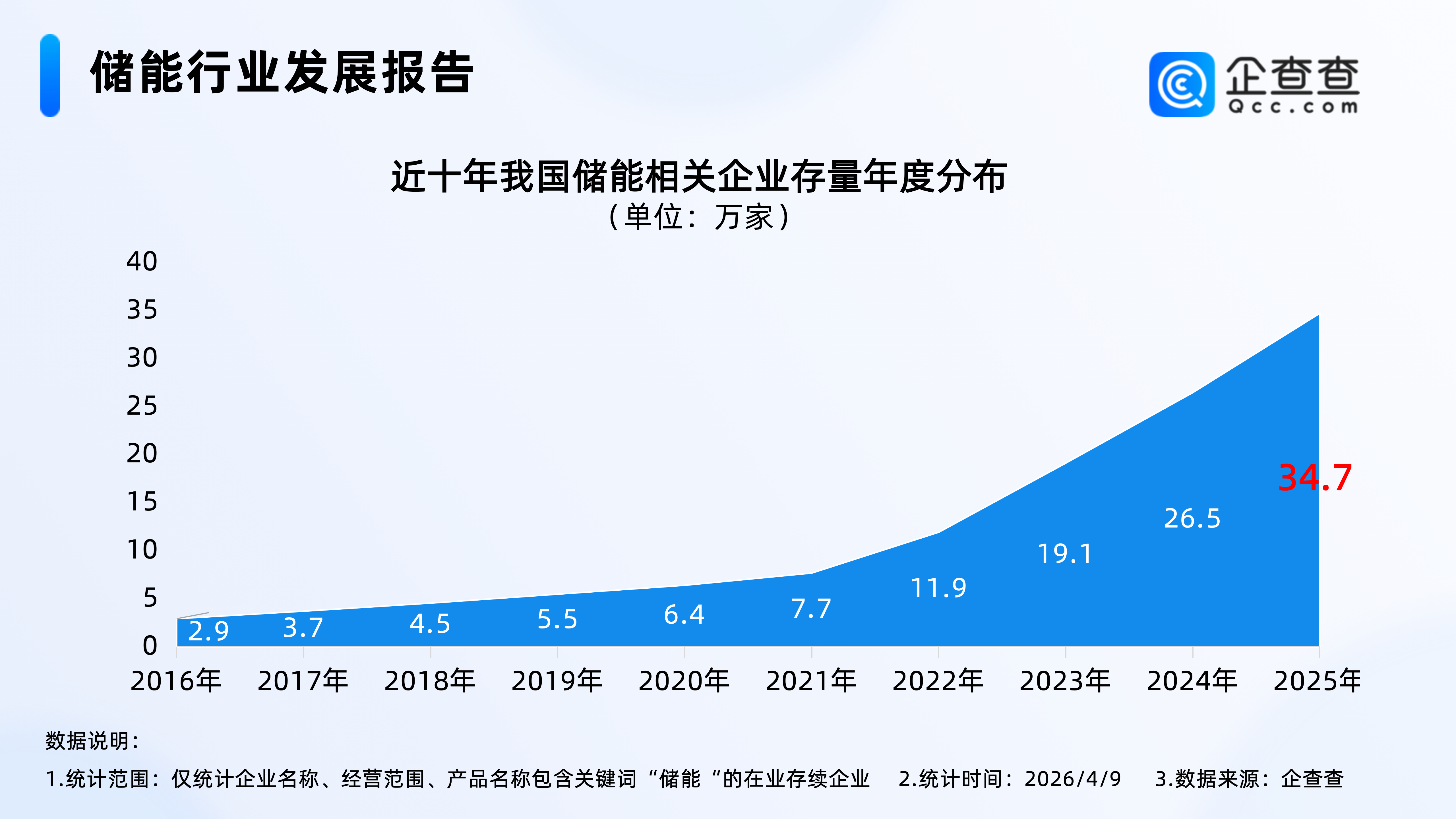 企查查數據顯示,2021年開始,我國儲能相關企業存量增速加快,次年首次突破10萬家,達11.9萬家,2025年年底,我國在業存續34.7萬家儲能相關企業;截至2026年4月9日,我國現存36.9萬家儲能相關企業。