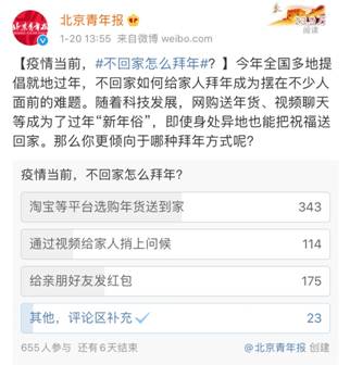 隨著各地陸續出臺就地過年的倡議,不回家怎么拜年已經成為社會熱議的話題。近日就有媒體在微博上發起了拜年方式的投票,結果顯示網購年貨寄回家的“淘寶式拜年”成為最多網友選擇的“云上拜年”新年俗。有網友評論道:這回不用和老公為去誰家過年掐架了,淘寶代轉年貨,二人世界走起!