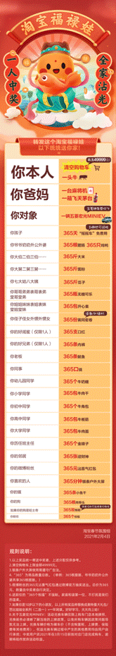 說中獎者最有福氣,是因為淘寶會幫“福祿娃”把需要拜年的親朋好友們的獎品安排得明明白白,包括但不限于:他的爸爸媽媽、爺爺奶奶、外公外婆、七大姑八大姨、小學同學到大學同學到班主任、鄰居到同事到老板、閨蜜好兄弟以及現任前任們……都有新年禮物!